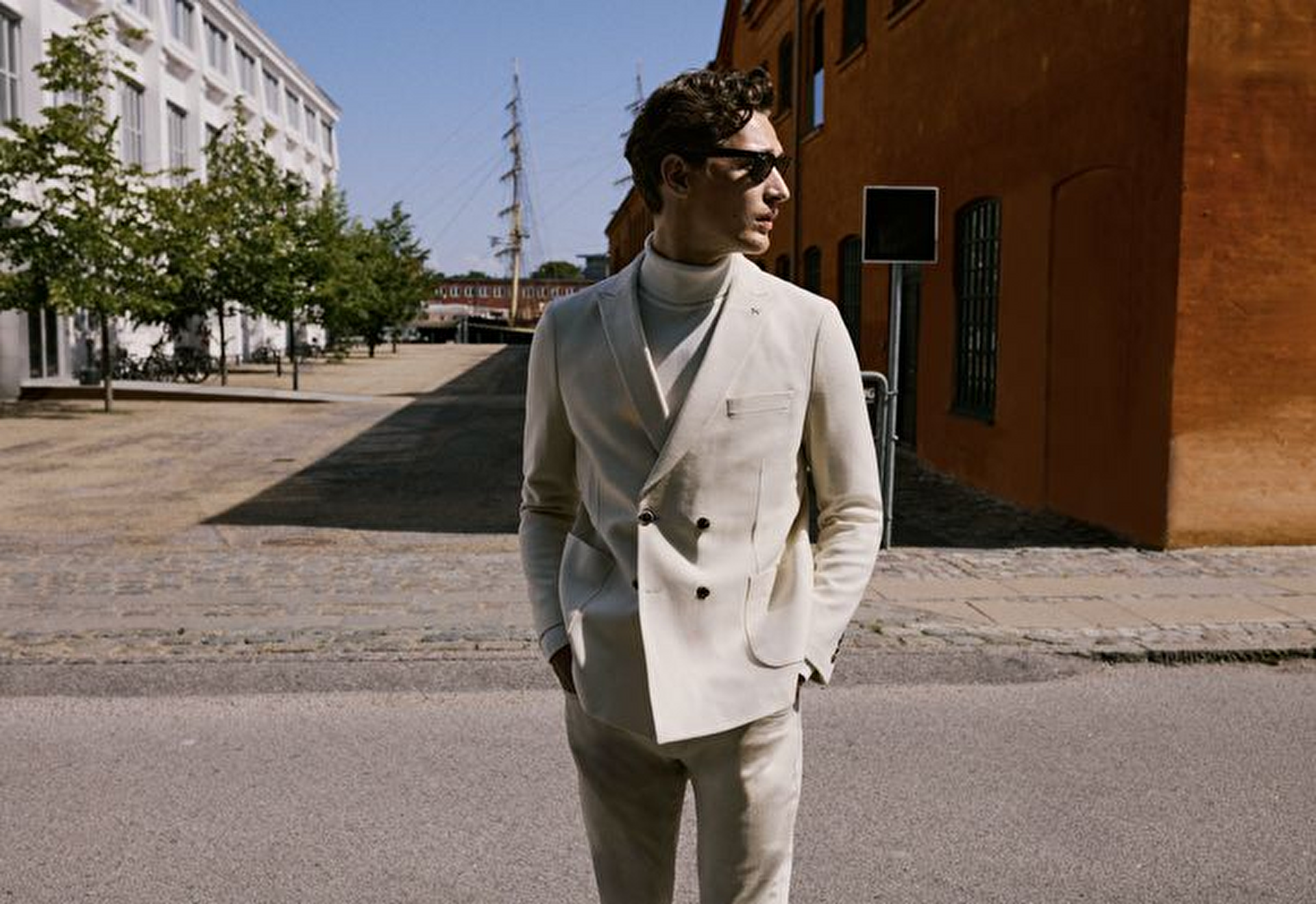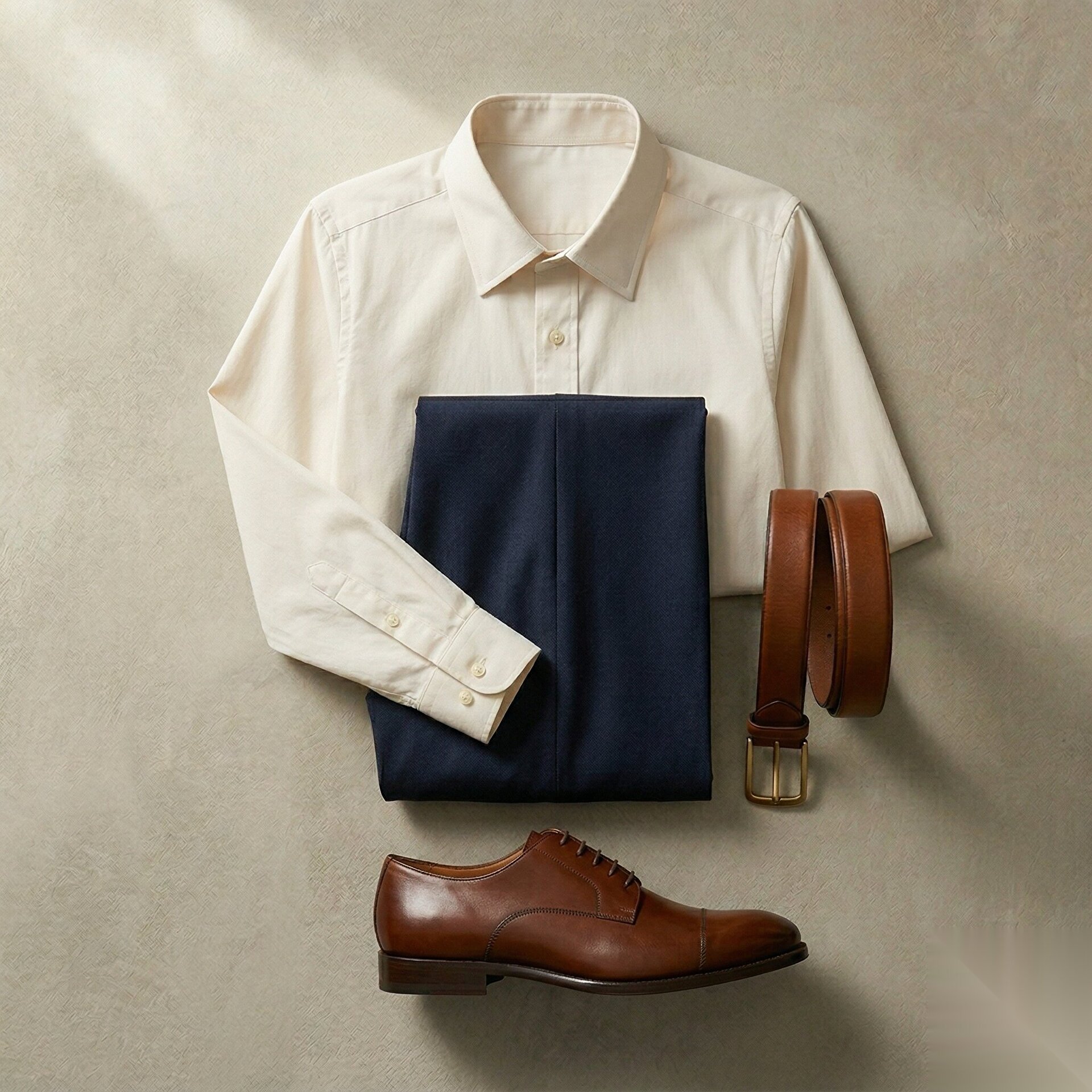 Toprak Paleti: Kum rengi takım elbise + açık mavi gömlek + koyu kahve loafer.