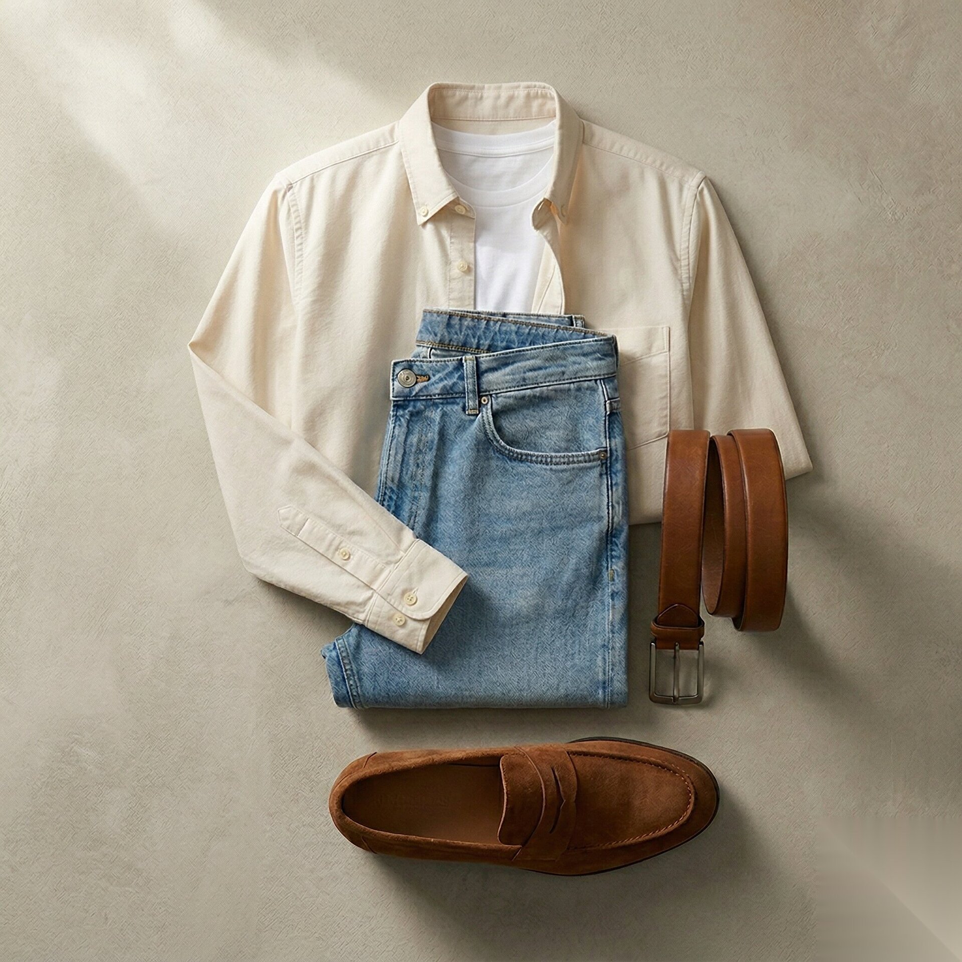 Toprak Paleti: Krem overshirt + açık mavi denim + taba süet sneaker/loafer.