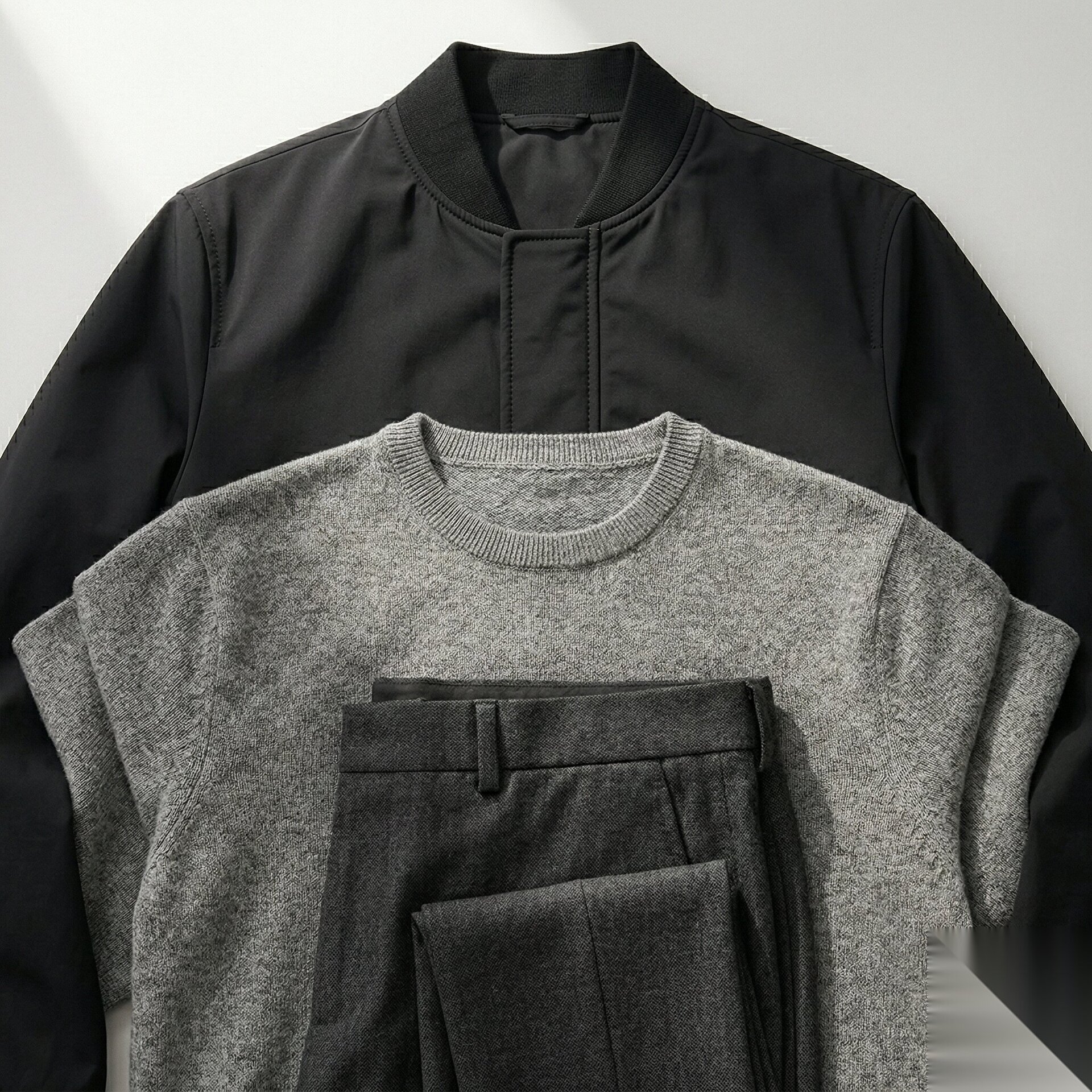 Klasik Nötr: Siyah bomber + gri melanj triko + antrasit pantolon.