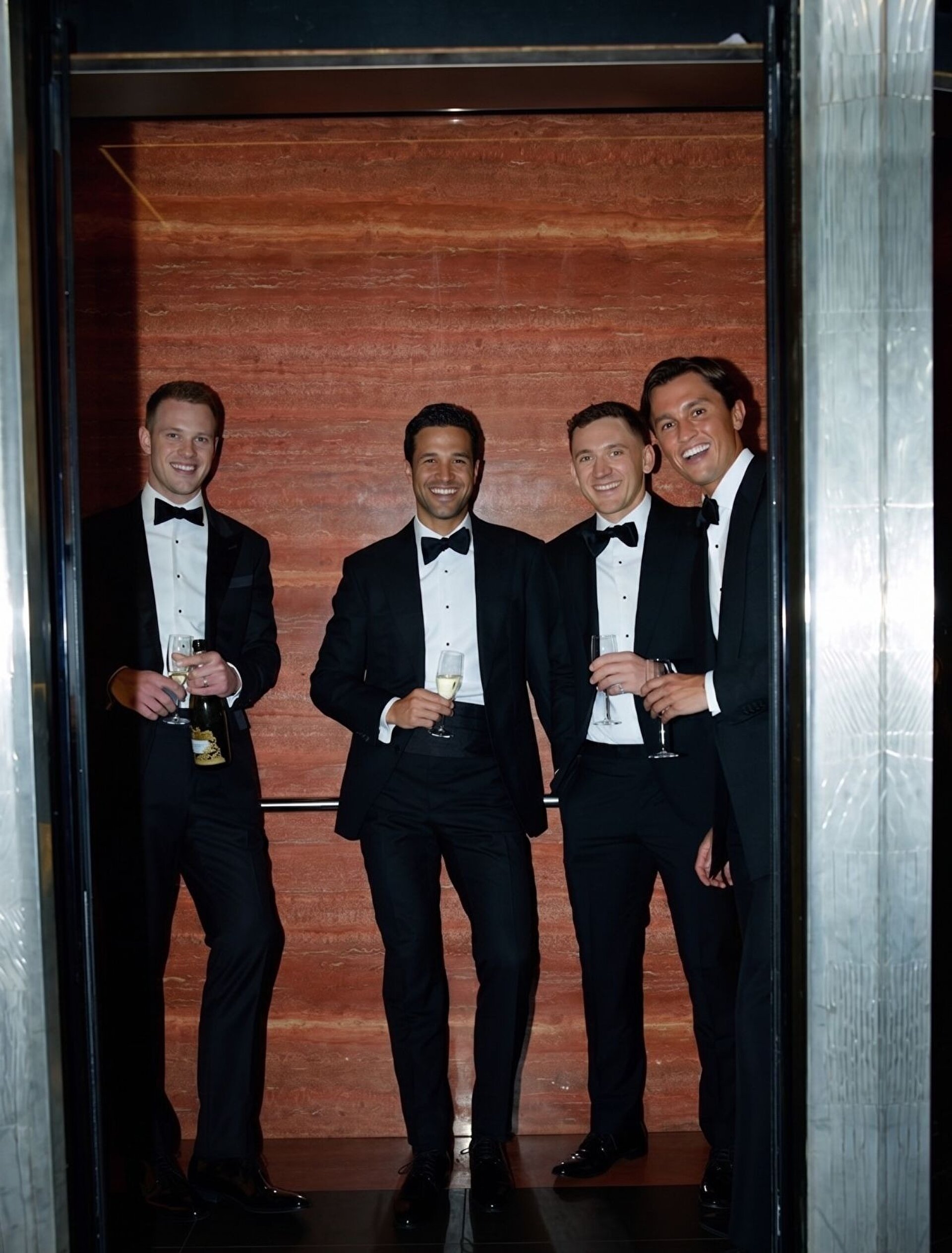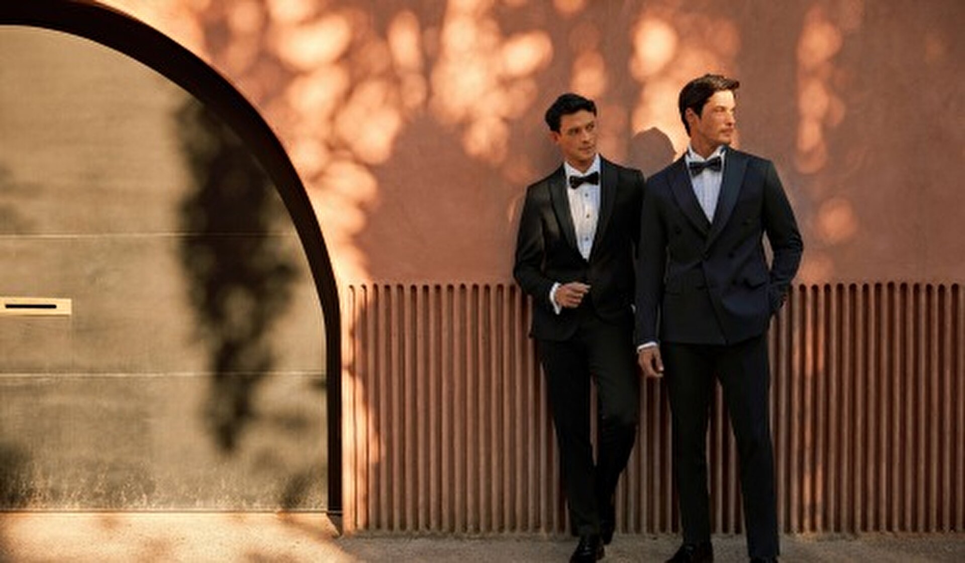 Daha mat kumaş tercihi, papyon yerine sade bir kravat kullanımı veya mendil ve manşet gibi detayları daha minimal tutarak bu farkı yaratabilir. Renk paleti yine koyu tonlarda kalmalı bu konuda hem fikiriz ancak ton derinliği ve parlaklık seviyesi ise damadın bir adım gerisinde olmalı.