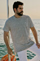 %100 Keten Slim Fit Dar Kesim Çizgili Bisiklet Yaka Gri-Ekru Tişört