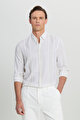 Pamuklu Keten Slim Fit Dar Kesim Düğmeli Yaka Çizgili Bej-Ekru Gömlek