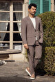 Slim Fit Dar Kesim Kırlangıç Yaka Kapak Cepli Çizgili Esnek Kahverengi Takım Elbise