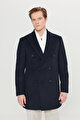 Yünlü Slim Fit Dar Kesim Geniş Kırlangıç Yaka Yan Cepli Diagonal Desenli Lacivert Palto