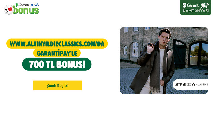 • altinyildizclassics.com'da Bonus kredi kartları ile tek seferde, peşin veya taksitli alışveriş yaparak ödemesini GarantiPay ile tamamlayan müşteriler 5000 TL ve üzeri harcamaya 700 TL bonus kazanacaktır.