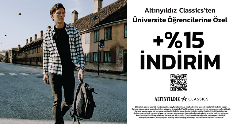 • Altınyıldız Classics mağazalarındaki öğrenci kampanyası görselinde yer alan QR kodu okut, edu.tr uzantılı mail adresinle sayfaya kaydol, e-mail adresine gelecek kodla %15 indirim kazan.