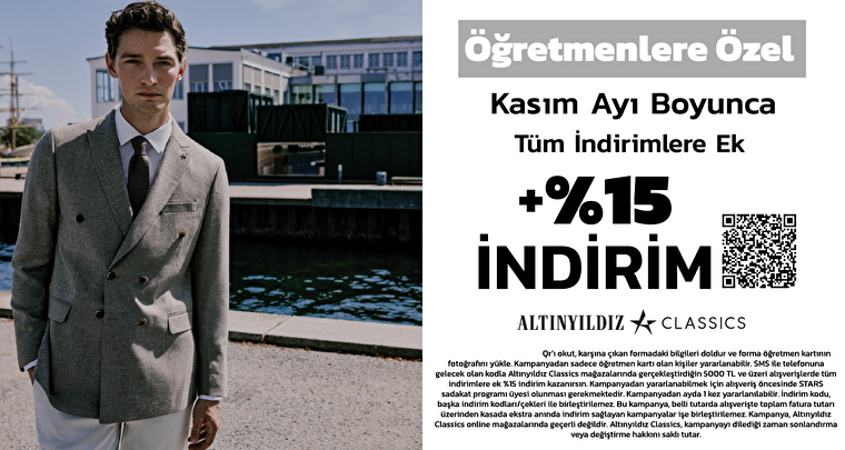 • Kampanyadan sadece öğretmen kartı olan kişiler yararlanabilir. SMS ile telefonuna gelecek olan kodla Altınyıldız Classics mağazalarında gerçekleştirdiğin 4000 TL ve üzeri alışverişlerde geçerli tüm indirimlere ek %15 indirim kazanırsın.
